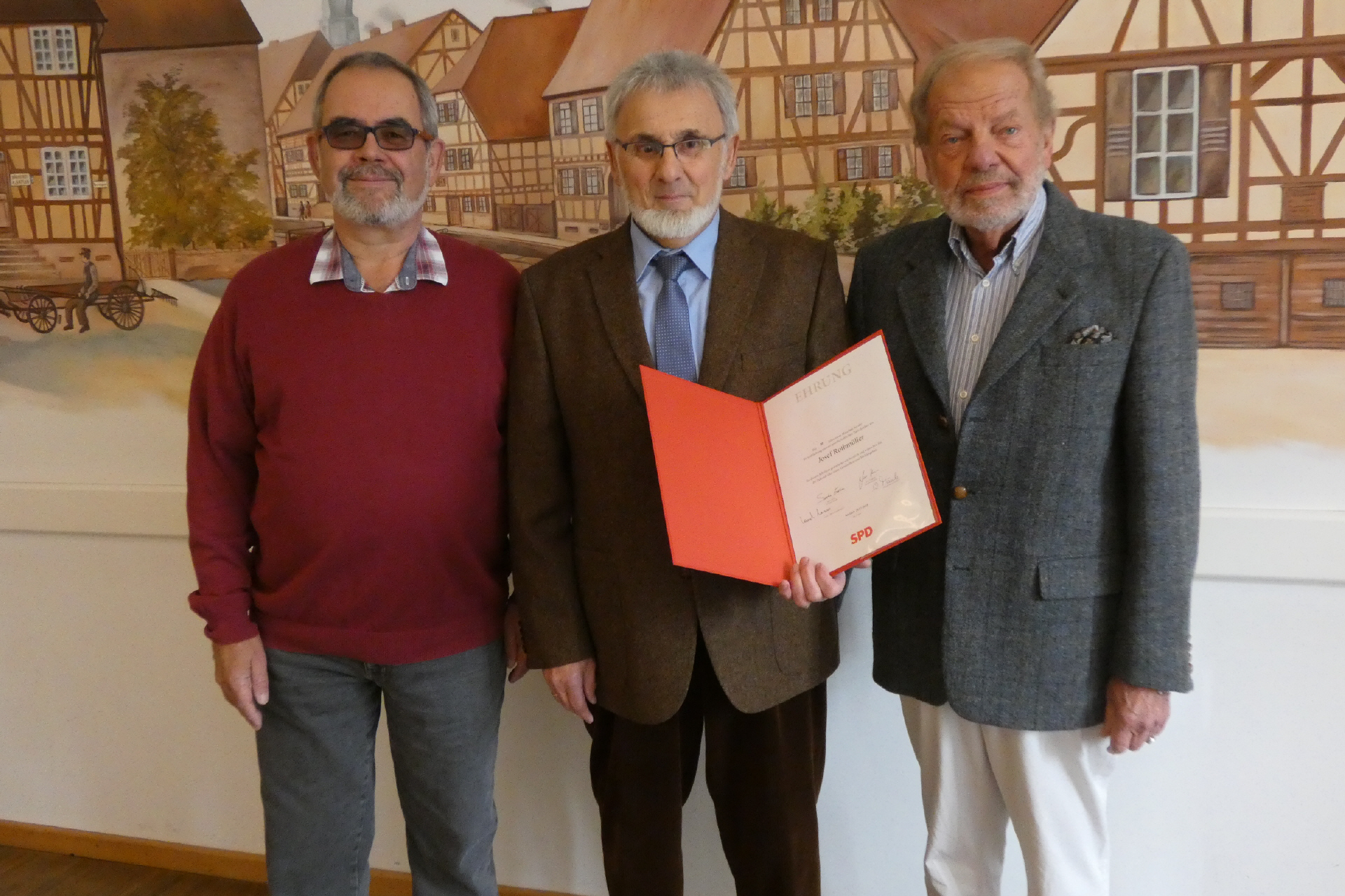 Josef Rothmüller kann auf 50 Jahre Parteimitgliedschaft zurückblicken. In dieser Zeit begleitete er viele Ämter für die Partei und die Gemeinde Rimbach. Dafür wurde er jetzt vom Ortsvorsitzenden der Sozialdemokraten, Werner Mäule, und dem Fraktionsvorsitzende Rolf Ihrig geehrt.